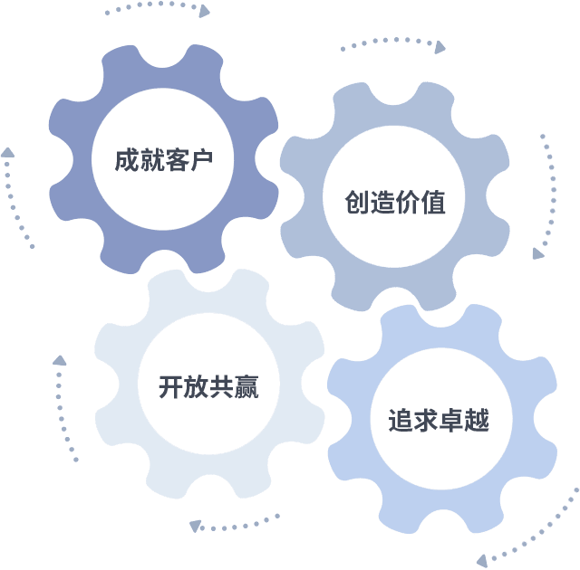 成就客户是一切决策的出发点,,,,创造价值是衡量所有工作的标准,,,,追求卓越是我们做事做人的态度,,开放共赢是我们的格局也是最终的结果。。价值观的齿轮环环相扣,,,推动着组织里的每个人不断向前。。。