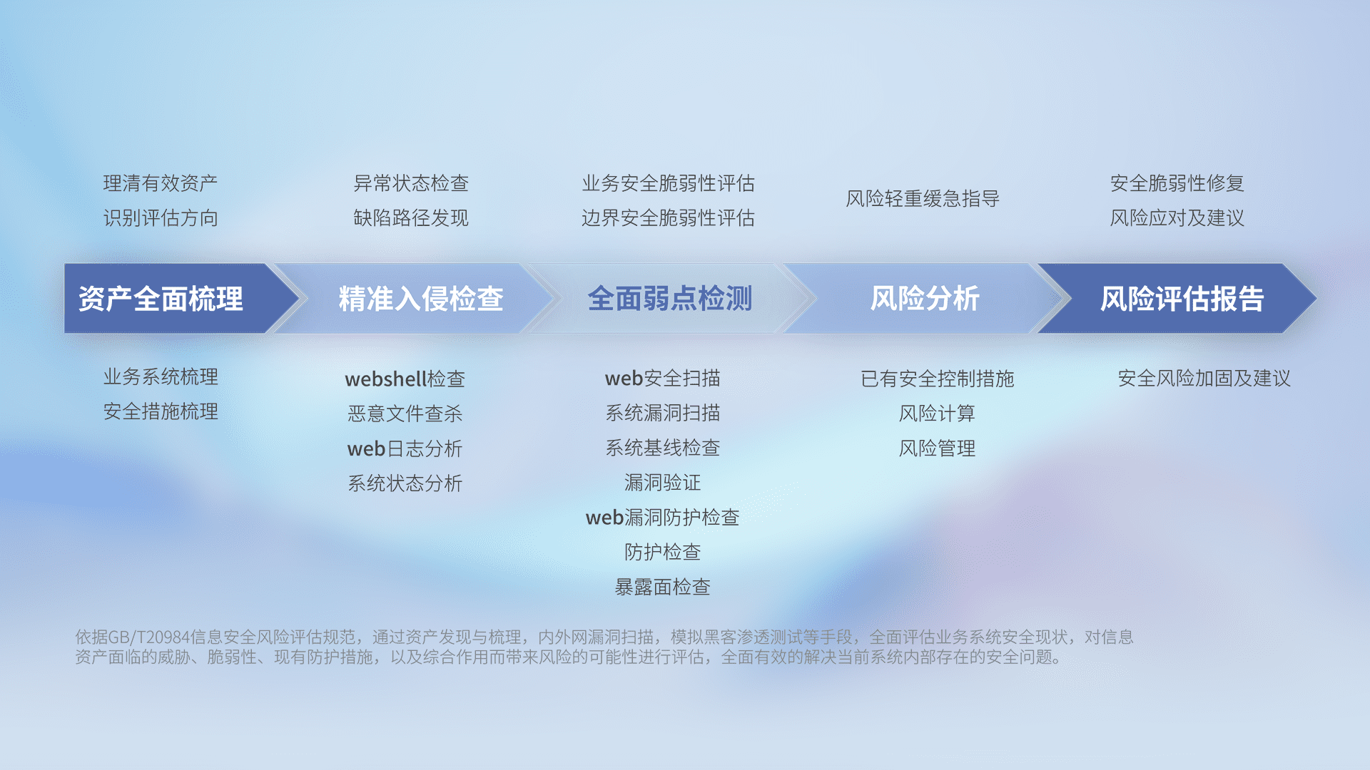 针对客户行业特性,,,,以专业的安全服务+多厂商联合解决方案提供专属的一站式安全管理服务,,,帮助客户全面感知网络空间威胁,,,,基于识别、、、、检测、、、分析、、防护、、、、监测、、、响应的服务理论模型,,,,从方案咨询、、、集成交付、、、评估验证、、、优化加固、、、、运维运营,,致力于为客户提供完整的闭环管理式安全服务。。。。以实战经验为客户打造高抵御风险的安全体系,,,,帮助客户发现威胁、、、对抗威胁、、处置威胁,,,不断积累安全对抗能力,,,,持续保障数字化安全。。