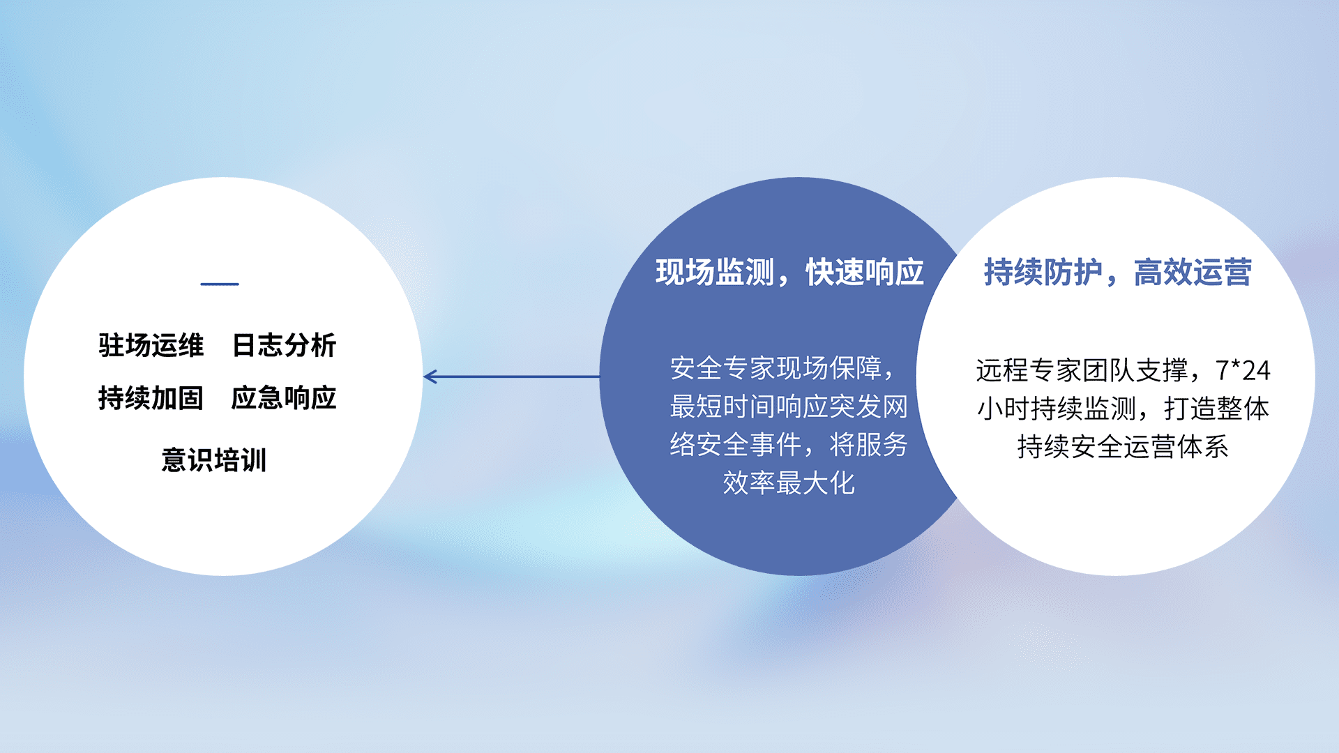 针对客户行业特性,,,提供专属的一站式安全管理服务,,,帮助客户全面感知网络空间威胁,,,,通过安全专家的线上、、、、线下防护支持,,,,实现风险闭环,,,,将安全保障常态化,,,为客户打造常态化安全运维运营服务。。。。